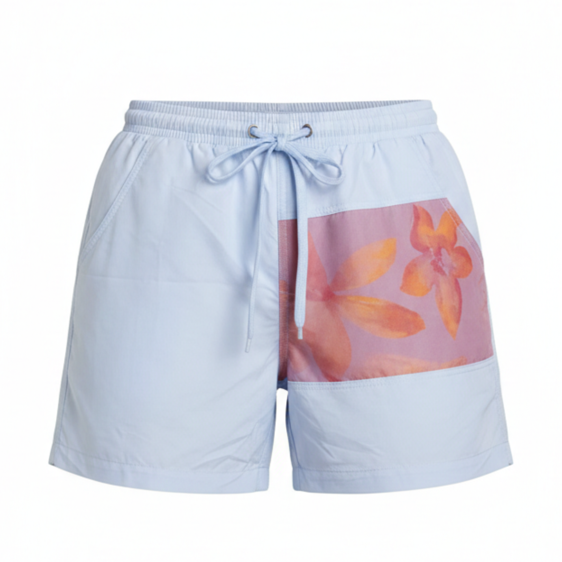 شورت سنسيت مستوحى من تدرجات ألوان غروب الشمس ممزوجة برسومات أوراق الخريف، ومطبّق على جانب واحد ليمنح الشورت لمسة فنية لافتة وتفرّدًا أنيقًا.